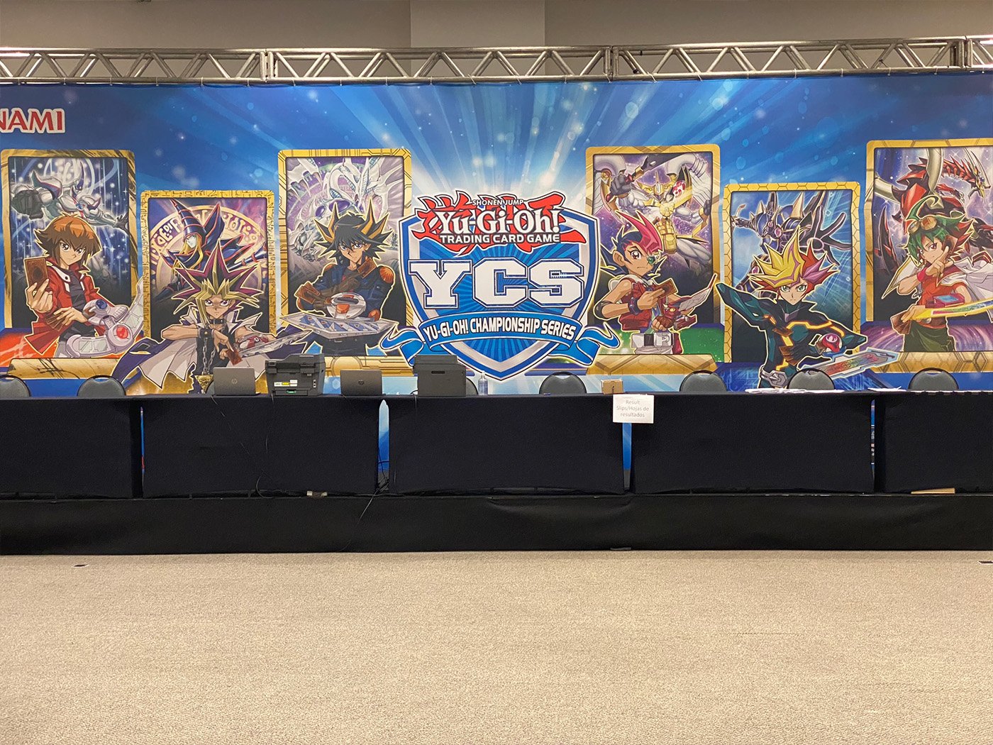 Fornecimento e montagem de estrutura Box Truss Q30 para o backdrop principal e cenografia do Torneio Mundial de Yu-Gi-Oh!, garantindo uma montagem robusta para um evento de padrão internacional.