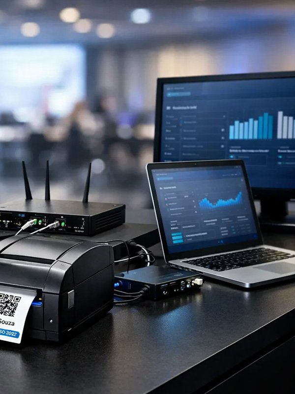 - Impressoras Térmicas: Para impressão rápida de crachás e etiquetas no check-in.
